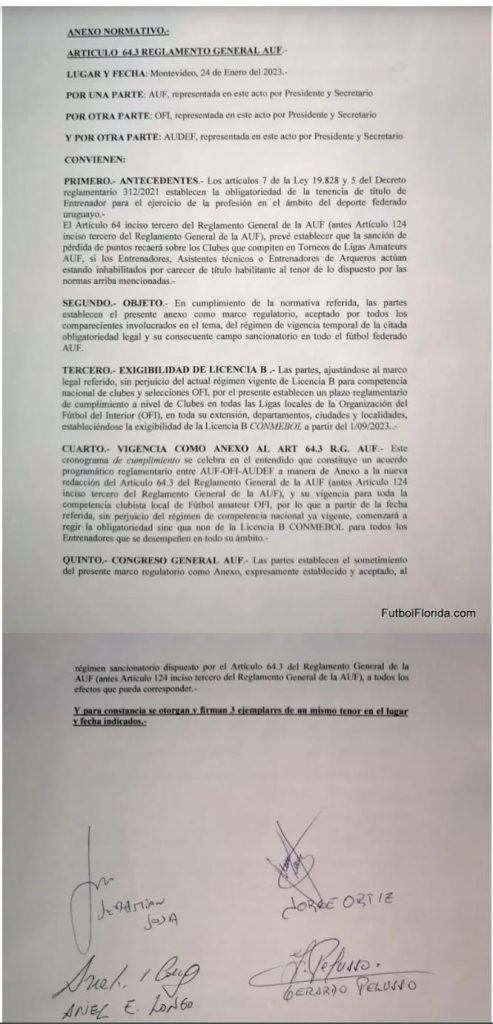 Corresponde comunicar con algarabía, que en el día de ayer, en cumplimiento de este régimen regulatorio, vigente en el fútbol AUF desde 1999, se celebró un histórico acuerdo entre OFI y AUDEF por el cual a partir de setiembre del corriente año, se exigirà el Título de Licencia B para Entrenadores que actúen en todas las competencias de Ligas, Clubes y Selecciones de la Organización del Fútbol del Interior.