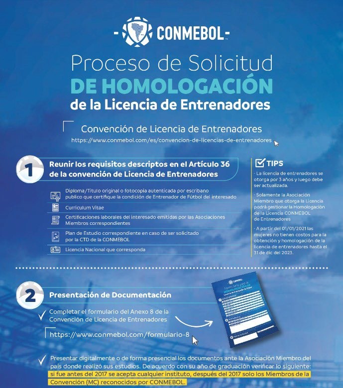 Solamente la Asociación Miembro que otorga la Licencia podrá gestionar la Homologación de la Licencia Conmebol de Entrenadores.